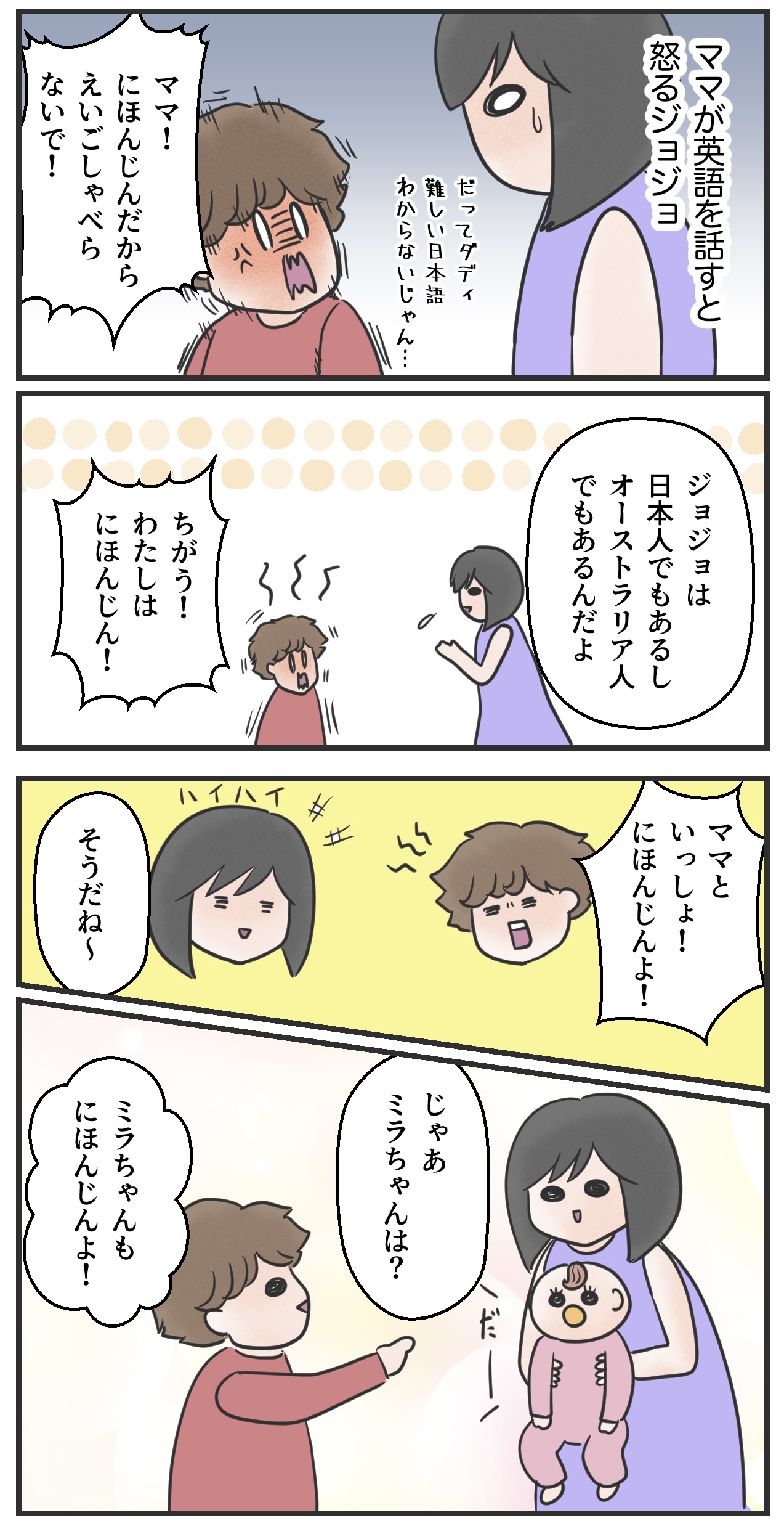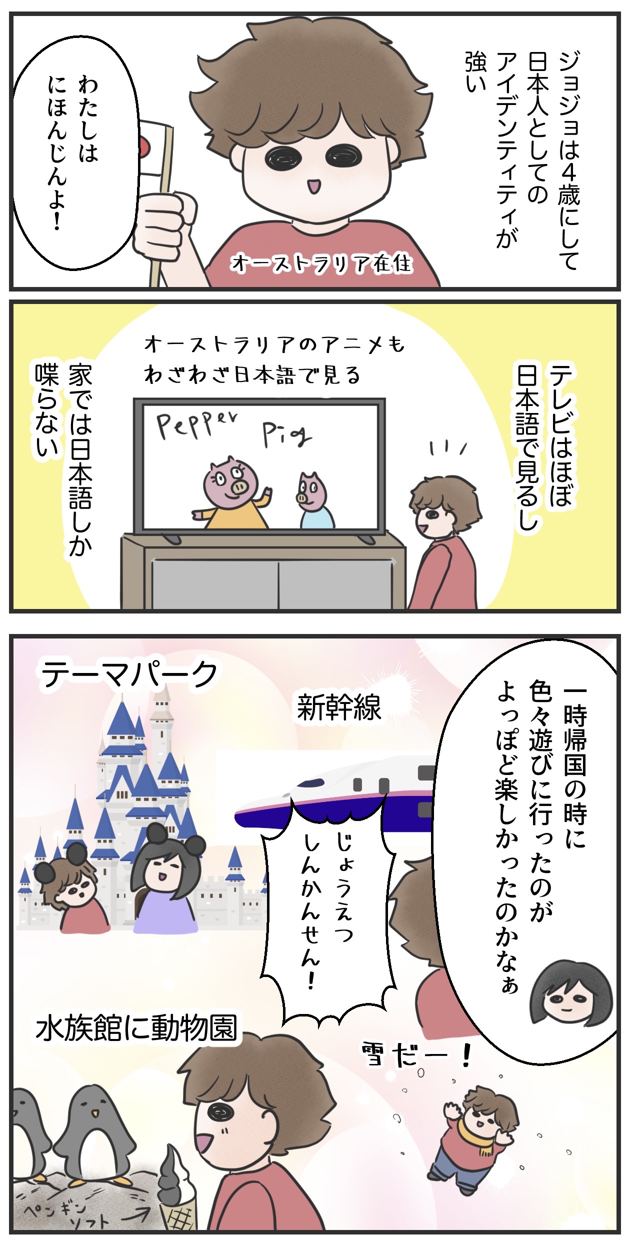 【ハーフ子育て白書】日本人アイデンティティが半端ない息子 2024年02月09日 19:00 うちの息子ジョジョは日本人アイデンティティが強く、自分はオーストラリア人ではない!と言います。正しいけどなんか仲間はずれみたいでかわいそうなダディ。。。日本人アイデンティティが強いのは私としては嬉しいですが、息子がオーストラリアで精神的に暮らしづらくなるといった事がないように見守っていきたいと思います。ライブドアアプリをインストールして下のバナーをクリックしてフォローすると更新通知が届きます↓ブログランキングに参加しています。1日1回クリックで応援していただけると泣いて喜びます。人気ブログランキングにほんブログ村他カテゴリの漫画 「ハーフ子育て白書 in AUS」カテゴリの最新記事 < 前の記事次の記事 >
